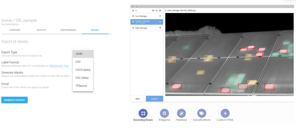 - Computer vision application을 구축하기 위한 데이터 annotation에서 가장 빠른 툴로 인식된다. - Labelbox를 사용하면 이미지와 텍스트의 기본 레이블을 간단하게 만들 수 있지만, point clouds, maps, videos or medical DICOM imagery와 같은 다양한 데이터 유형이 있으므로 맞춤형 레이블 인터페이스가 필요하다. 이를 위해 Labelbox는 사용자 지정 레이블 프런트 엔드를 쉽게 작성, 설치 및 유지 관리 할 수 있도록 설계하는데 도움을 준다. - labeling 결과를 csv, json 뿐만 아니라 일반적으로 많이 사용하는 데이터셋의 format(COCO, VOC, TFRecord) 등으로 export할 수 있어서 사용 중인 코드가 만약 저러한 format을 input으로 사용하도록 짜여 있는 경우 별도의 변환 과정 없이 쉽게 사용이 가능하다는 장점이 있다.
