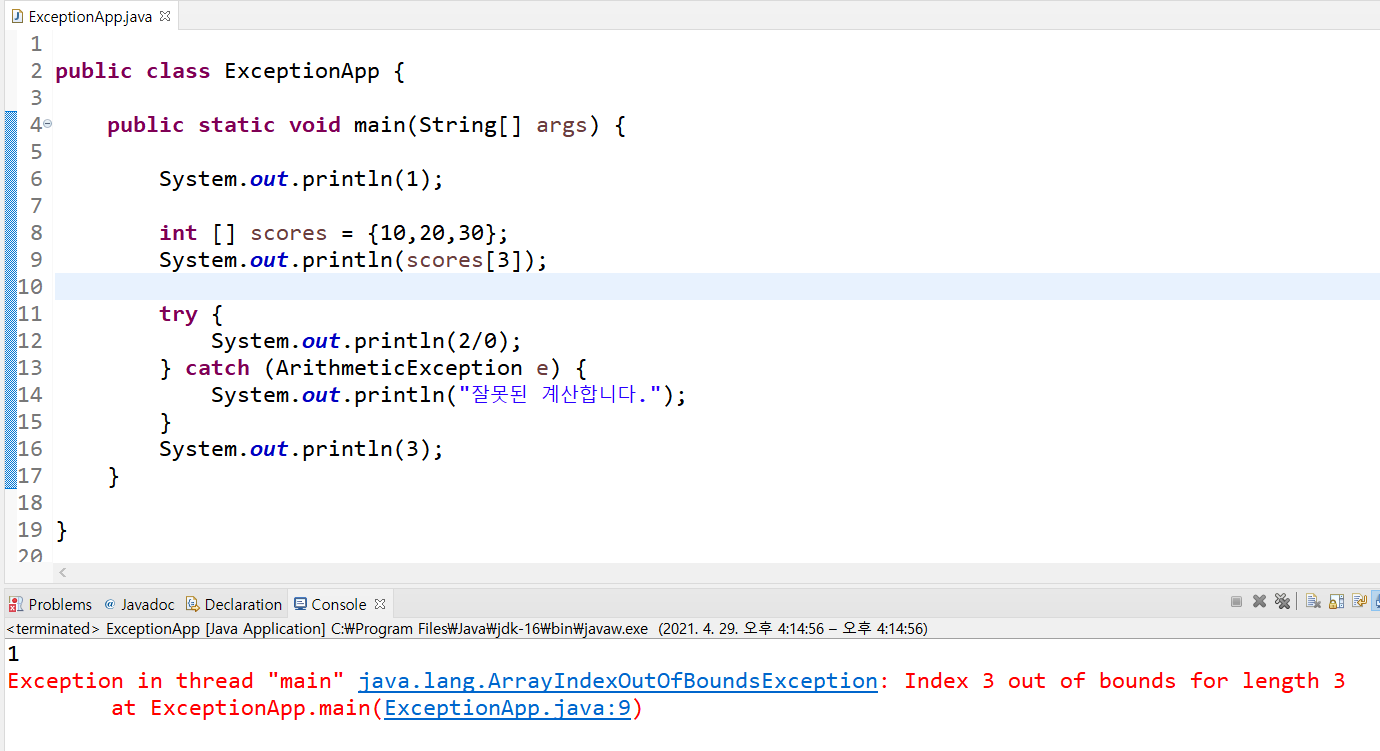 sout2번이 문제이므로 캐치문의 코드가 실행 되었다.
