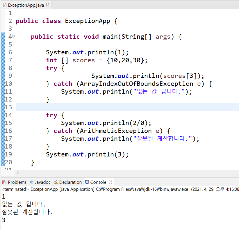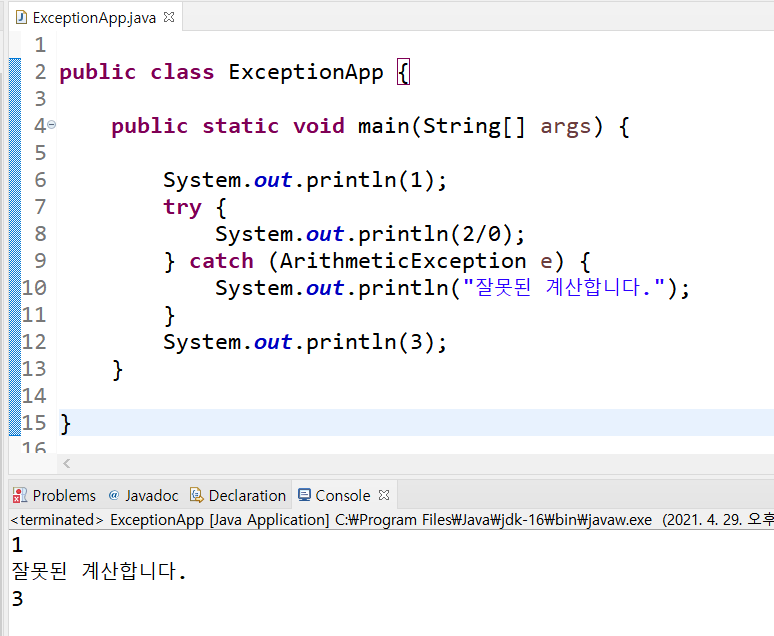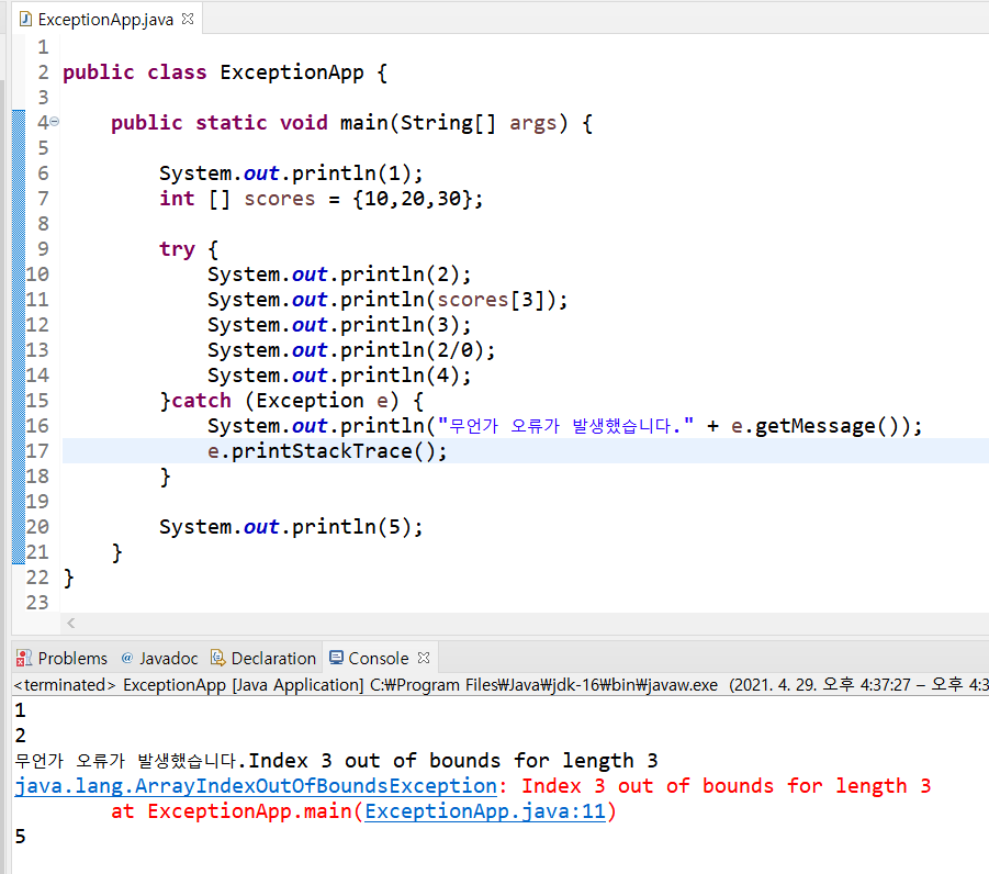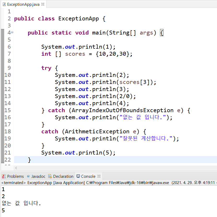 보다싶이 첫번쨰 익셉션에서 캐치문을 출력하고