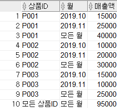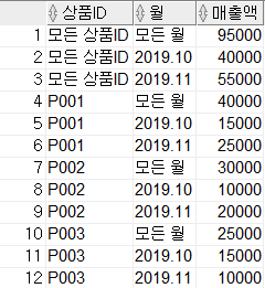 첫번째 인자(상품 ID)별 두번째 인자(월) + 첫번째 인자(상품 ID)별 두번째 인자(월)의 소계(SUBTOTAL) + 총계(GRAND TOTAL)