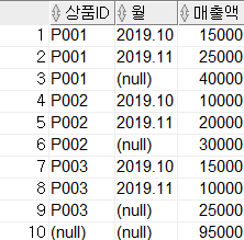 SELECT 상품ID, 월, SUM(매출액) AS 매출액